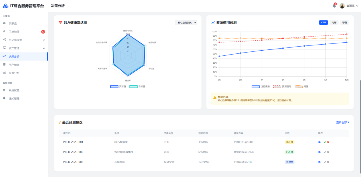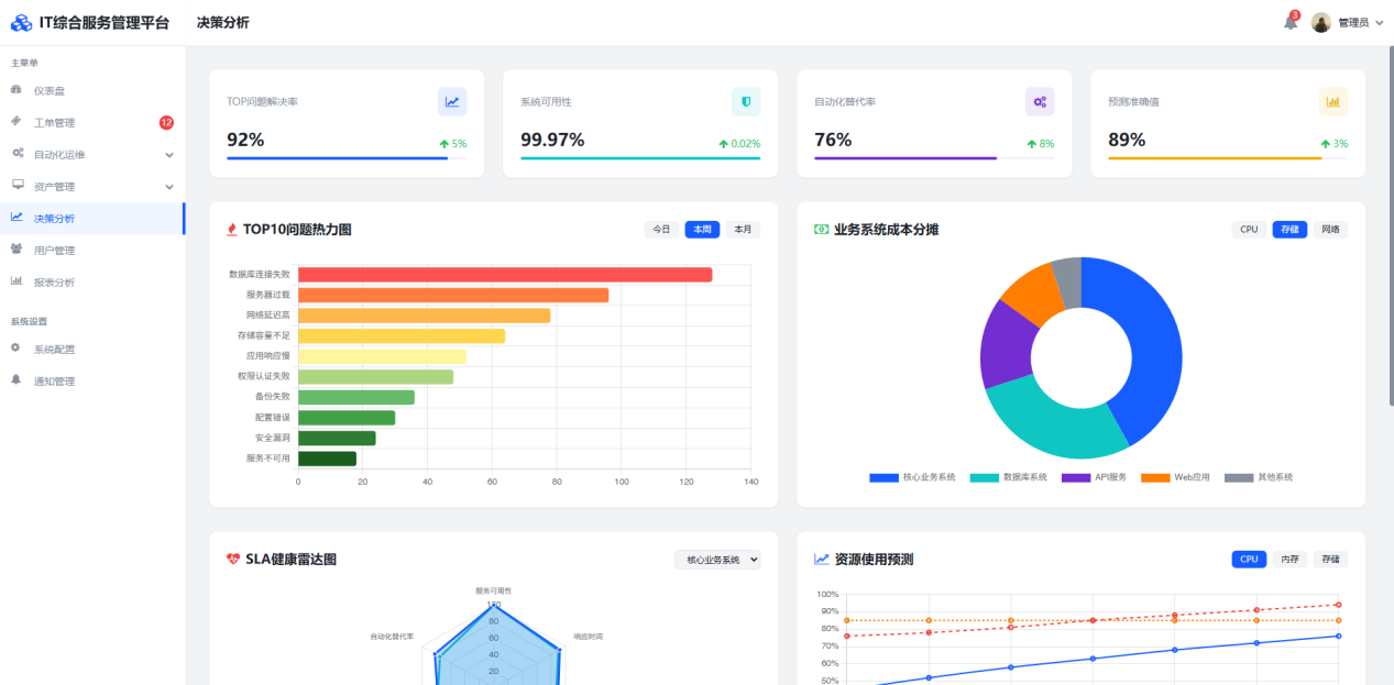 平台打造的决策支持体系可穿透IT资源成本黑洞。其动态成本热力图精准定位资源消耗前十的业务系统,清晰呈现CPU、存储及网络流量的分布态势,并生成自动化替代人工成本的对比分析报告,例如典型场景中密码重置工单量下降百分之七十带来的经济效益。在服务质量监控维度,独创的SLA健康雷达图持续追踪一线解决率、平均修复时间及用户满意度等关键指标,通过机器学习算法实现资源瓶颈的预测性告警,提前三小时预判潜在风险。某省级医保平台实际应用数据表明,该体系帮助客户降低35%运维人力成本,关键业务系统可用性提升至99.99%。