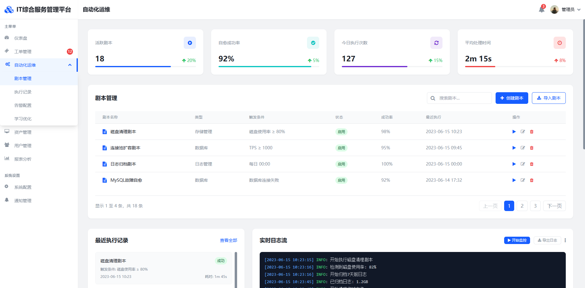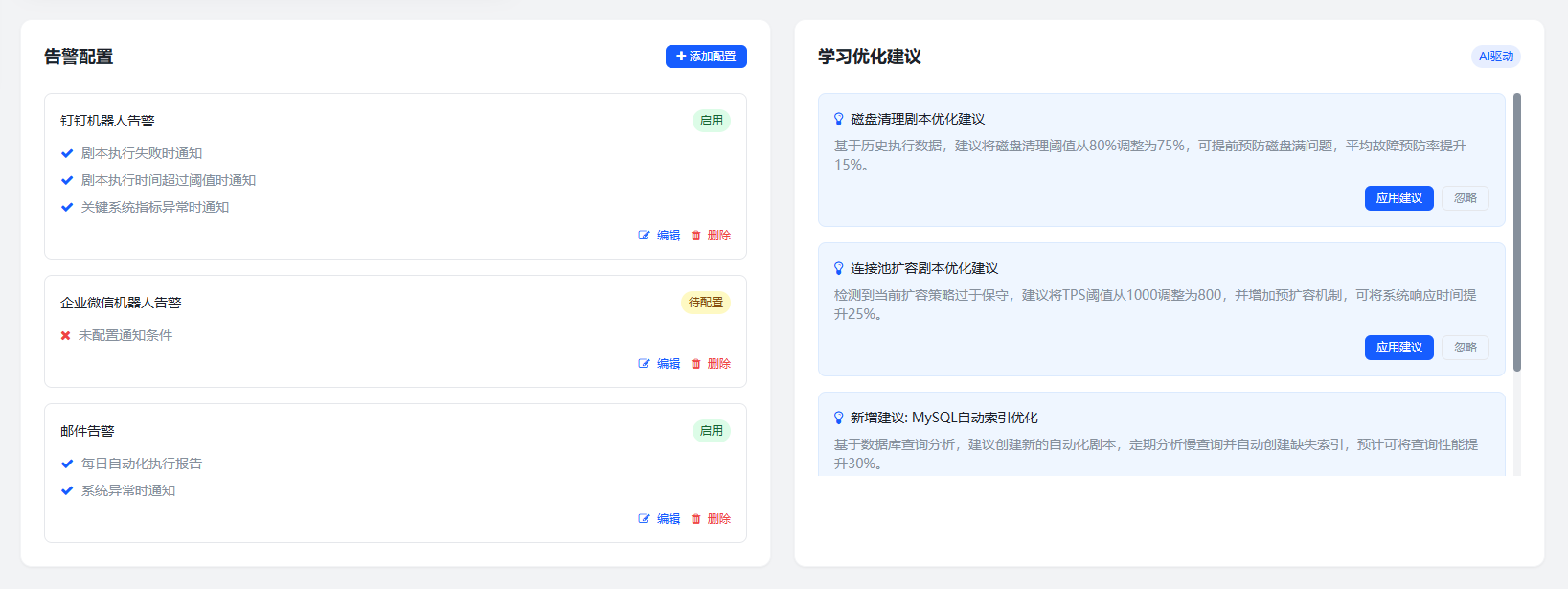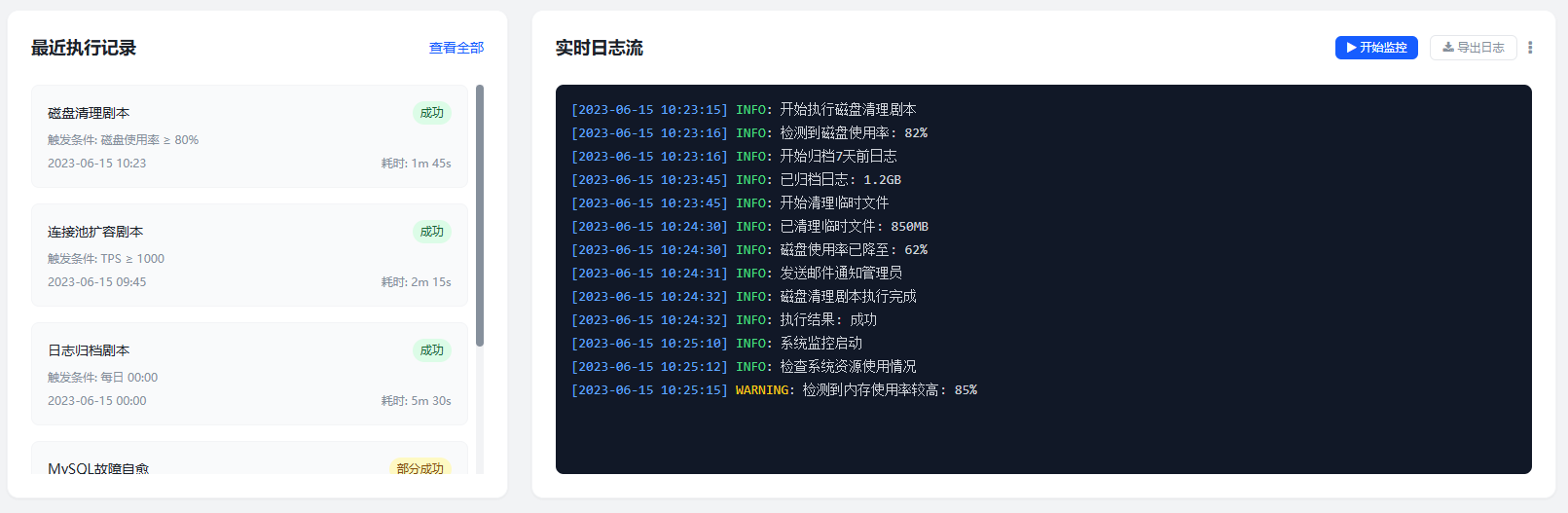 该模块提供可编排的运维自愈能力。用户可自定义场景化剧本,如磁盘清理剧本设置80%阈值触发日志归档并邮件告警,连接池扩容剧本监控TPS指标自动扩展容器实例。执行过程实时输出日志流,支持中断续 传与结果回溯。内置钉钉/企业微信机器人接口,关键操作自动创建战时协作群组并推送应急预案文档。系统持续学习处l理记录优化剧本参数,某客户实践表明MySQL故障自愈率提升至92%。