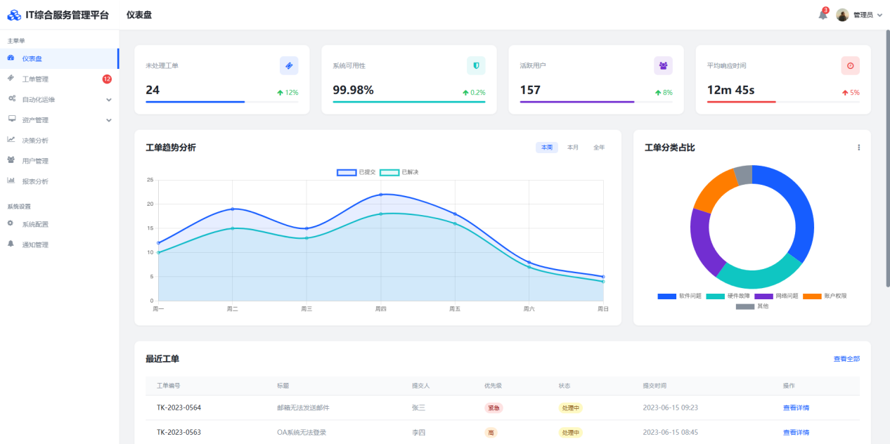 工单引擎内置多层自动化处理机制。工单提交阶段通过预训练NLP模型实现秒级分类,硬件故障自动触发备件库存校验并分派至属地工程师,软件问题则调用Ansible剧本库执行批量修复。处理过程实施SLA多级预警策略,当工单剩余时间低于阈值时自动升级至二线专家并同步通知用户。闭环阶段自动归因分析高频故障类型,驱动知识库条目优化更新。所有工单操作留痕可审计,支持按服务组、时间维度分析一线解决率与平均修复时长指标。