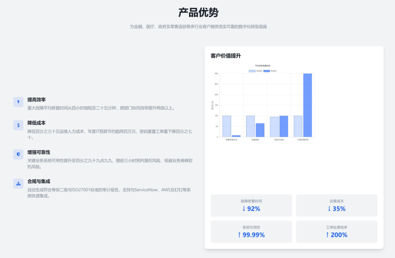 我们致力于突破传统IT管理的成本困局,将企业IT部门从基础设施维护者升级为业务创新伙伴。在金融行业场景中,平台实现核心交易系统故障的秒级切换,确保每秒万级交易请求的连续性;为医疗客户构建符合等保2.0的审计追踪链,满足电子病历系统配置变更的分钟级回溯;助力零售连锁企业完成超千台POS设备的远程批量巡检,运维效率提升80%。这些实践印证了平台作为数字化转型底座的战略价值——不仅降低35%的运维人力成本,更通过API经济开放IT能力,支撑客户快速响应市场变化。